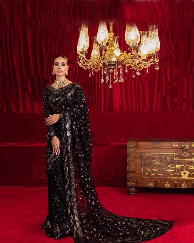 • 2.5 meters embroidered jaal with a border for pallu on chiffon