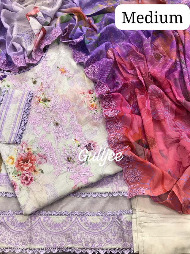Stitched floral printed sequence embroidered shirt paired with cut work embroidered and floral printed lawn dupatta and Dyed Cambric Trouser