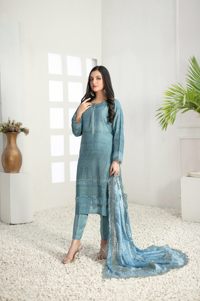 3 Pieces Stitched Collection By Tawakkal Fabrics, Attractive & Elegant Viscose Schiffli Collection comes with: