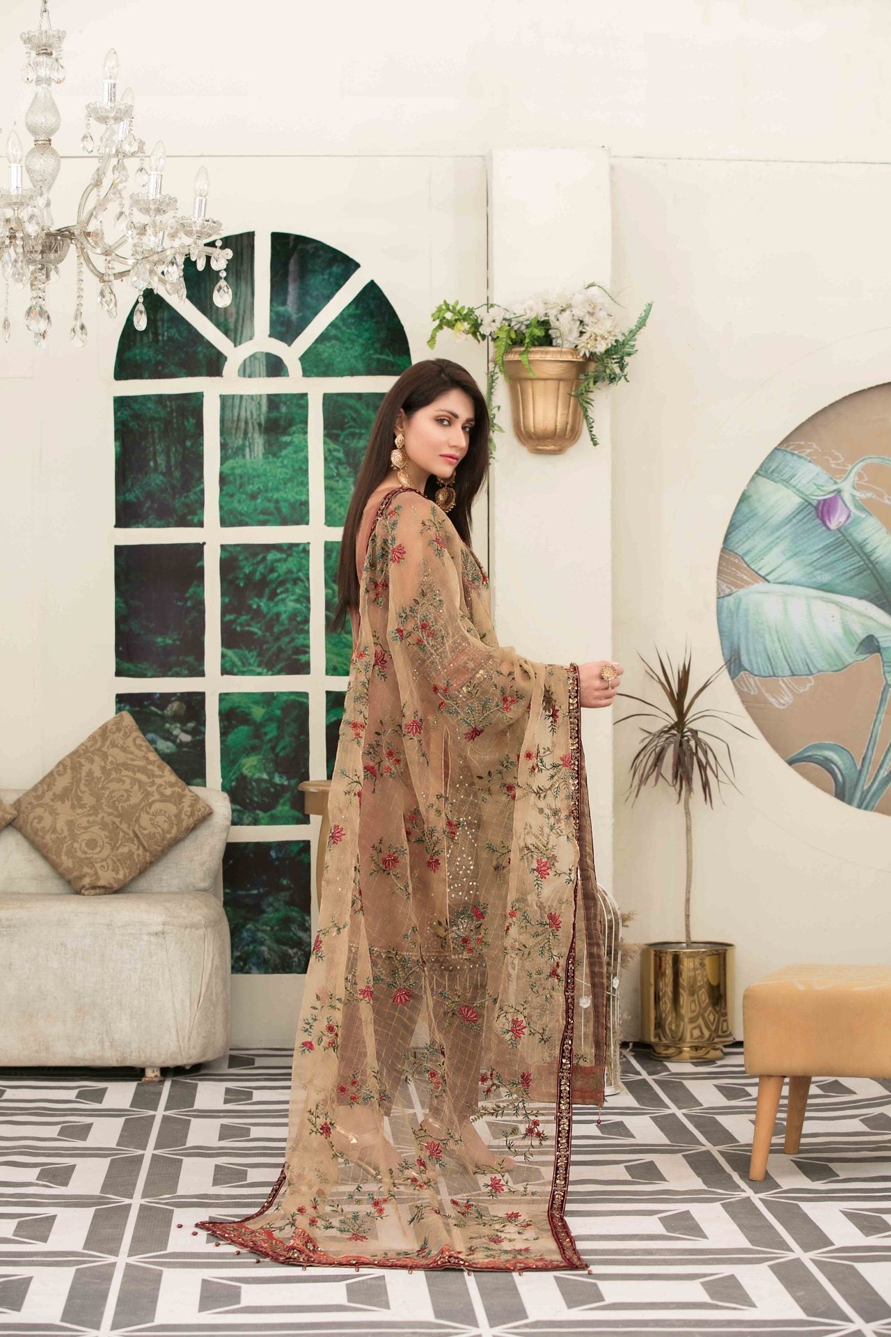 – Stitched embroidered khaddi shi organza broshia embroidered dupatta banarsi trouser