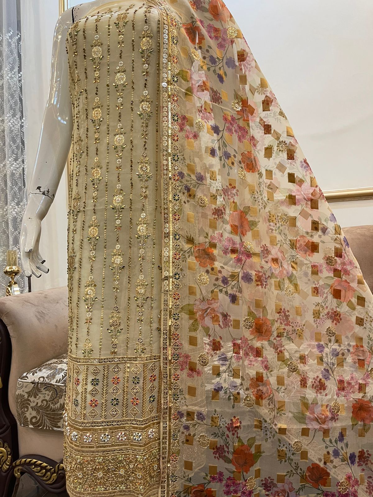 New Pure Chiffon Bareeze All Over Embroidered Front Very Decent Outfit Having Chicken Kari Borders With Embroidered Dupatta