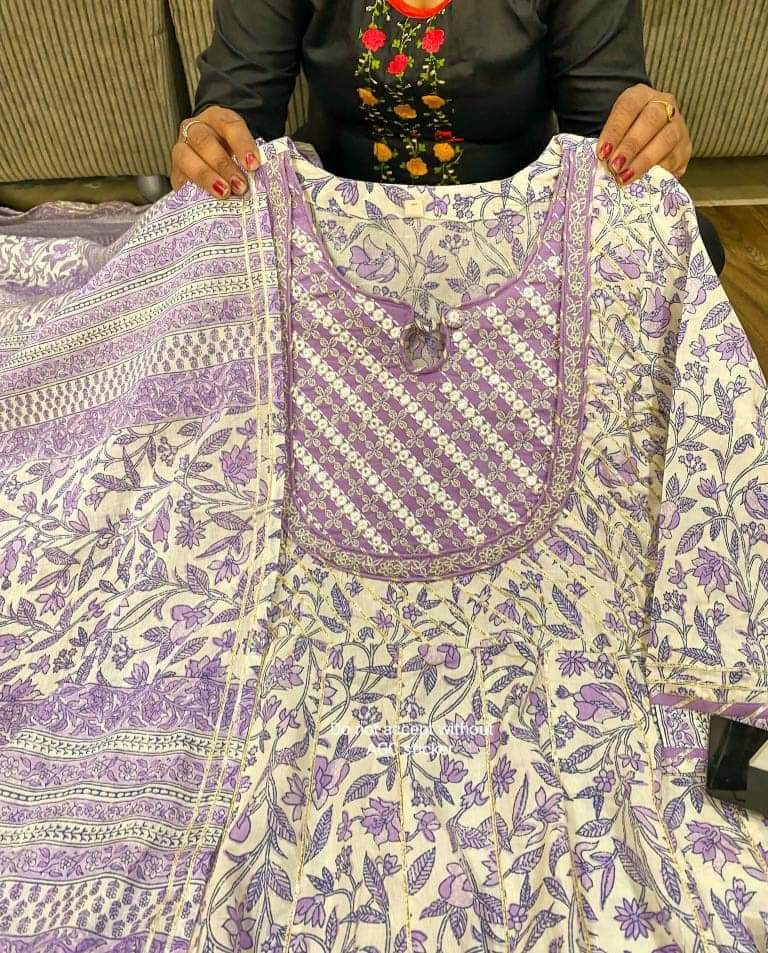 Premium kalamkari print corton anarkali gown detailed with beautiful mirror work & heavy gota work all over paired with cotton pant & mal cotton duppata .
