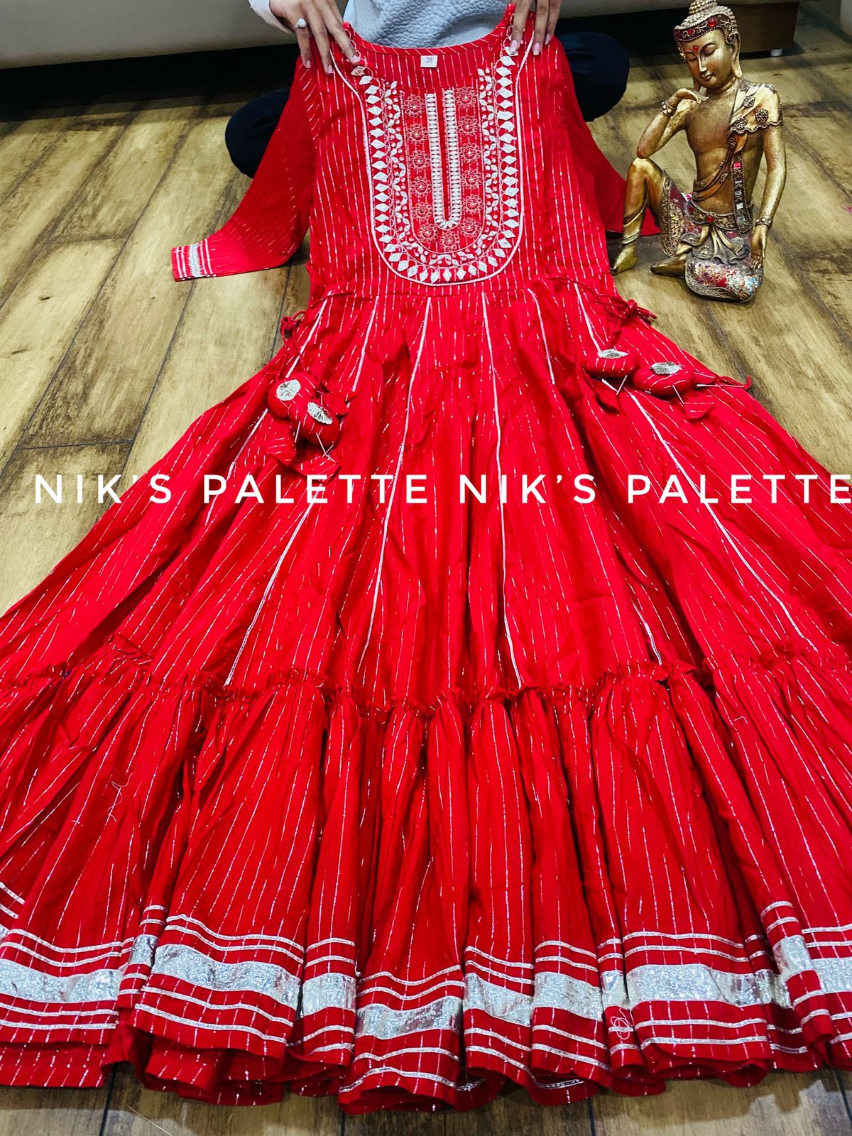 Premium *Lurex cotton* anarkali gown detailed with embroidery on yoke with gota work & heavy tassels Chiffon dupatta with gota lace & all over gota buti..
