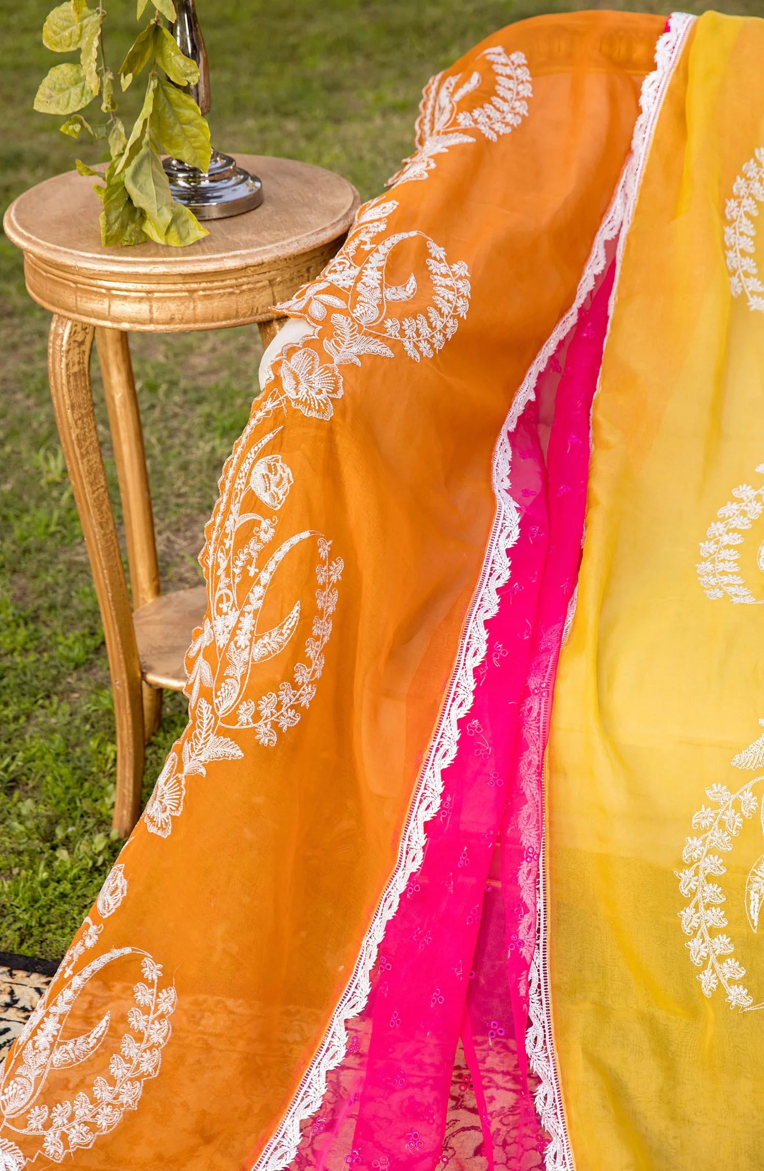 Embroidered organza dupatta with embroidered organza & net palu Patti patches