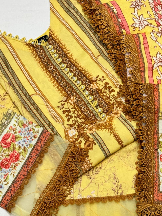 Dupatta: Luxury Digital Printed Linen Dupatta Along 4 Sided Lace.