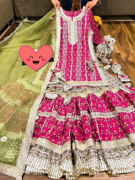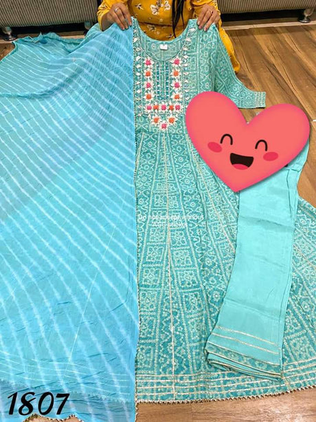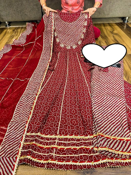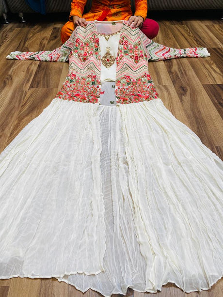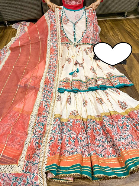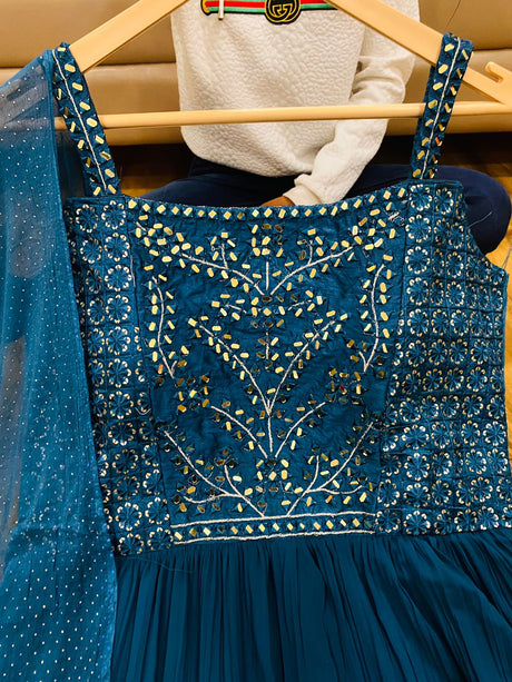 Premium Georgette pahariya print gown with lace paired with Shiffon dupatta Heavy work on yoke