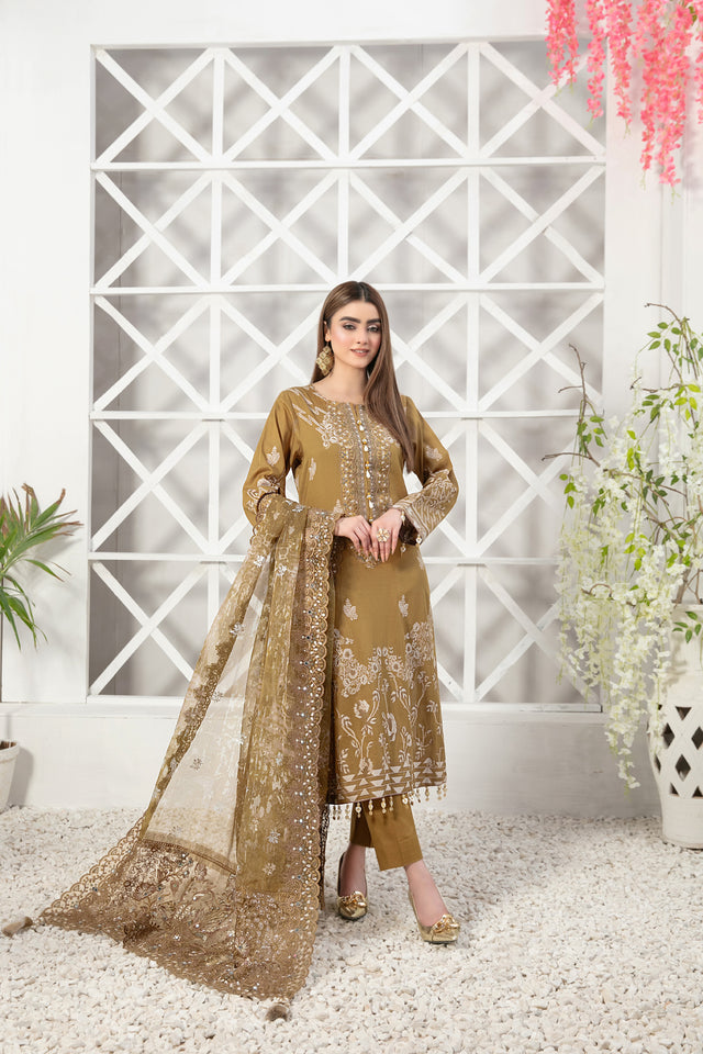 3 Piece Stitched Collection By Tawakkal Fabrics, Attractive & Elegant Lawn Banarsi Collection comes with: