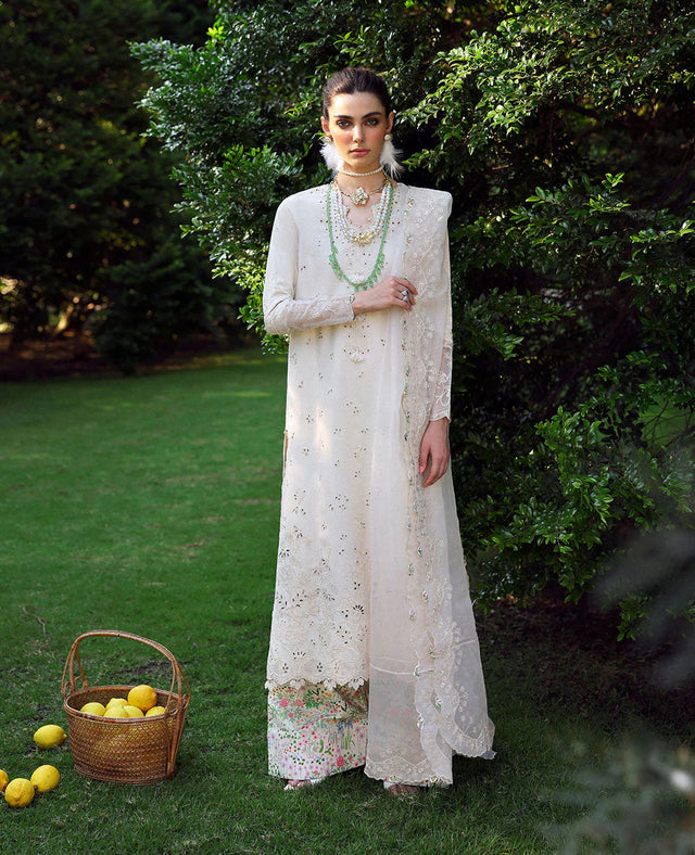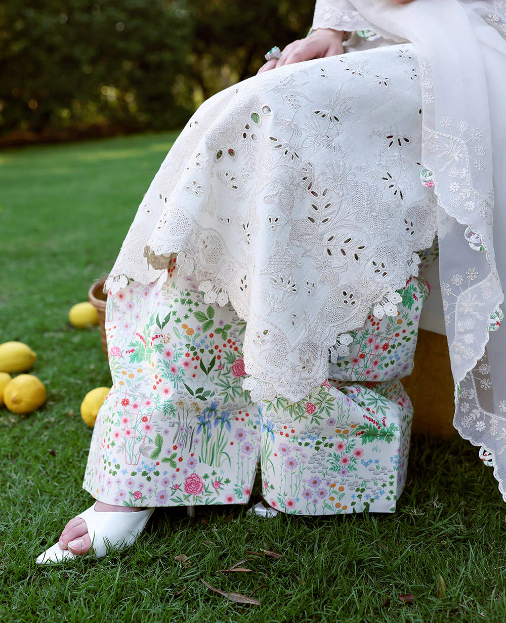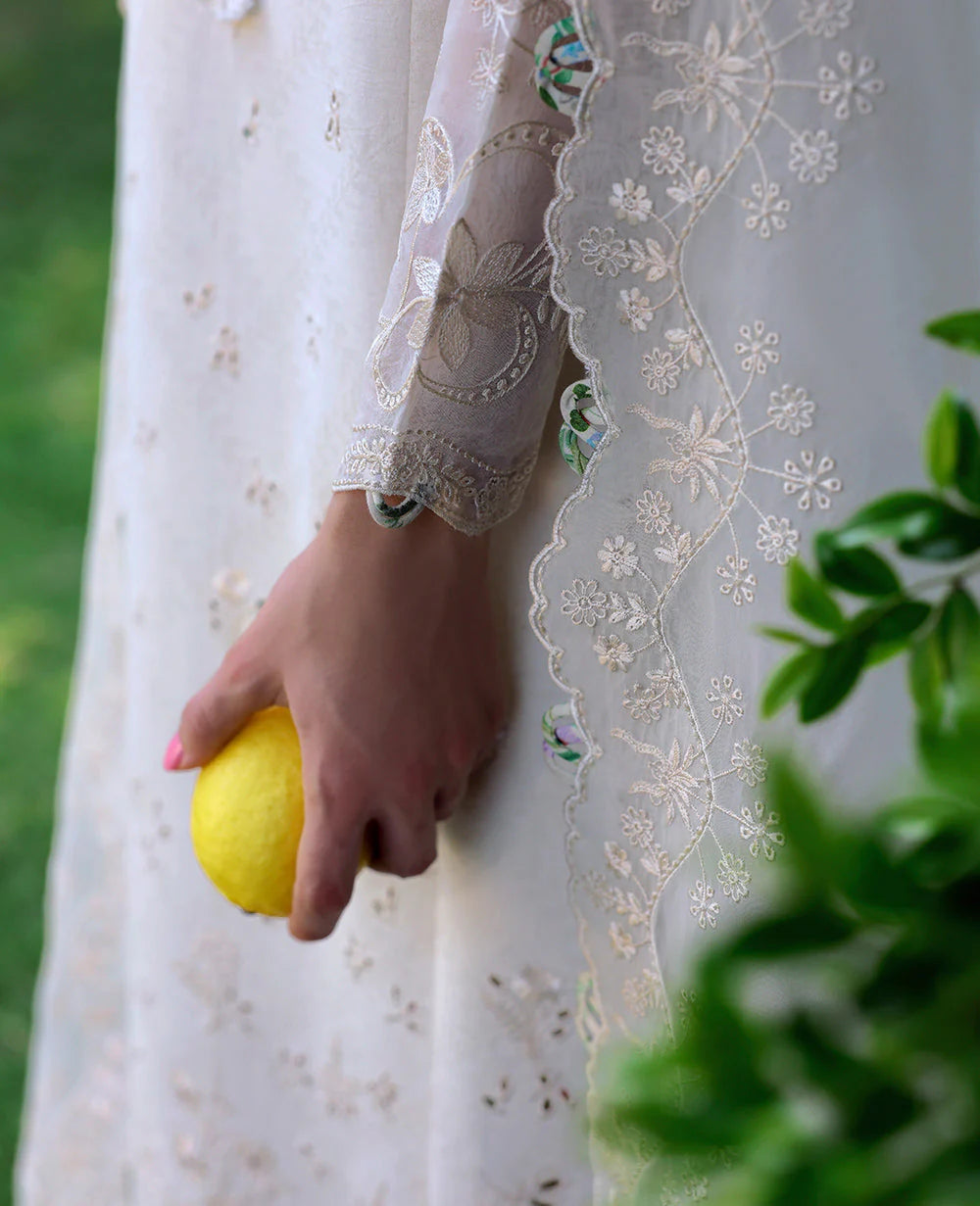 Exquisite in design, this self-jacquard fabric shirt features a three-panel embroidery layout, with side seams and scallopy embroidery details using a traditional boring technique. The self-embroidery color creates a seamless, textured effect. The organza dupatta is beautifully bordered on all four sides, with intricate pallu details for added sophistication. Paired with floral-printed Farshi shalwar and organza sleeve borders, this ensemble is further enhanced with needlework embroidery, showcasing elegant self-on-self motifs for a refined, timeless look.