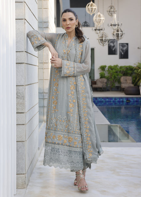 Front sequins embroidered on chiffon Back sequins embroidered on chiffon Sleeves sequins embroidered on chiffon Neck embroidered patch on organza Embroidered Daman lace for front and back 60 inches Sleeves embroidered lace 30 inches Dupatta sequins embroidered on chiffon 2.85 yards Raw silk trouser 2.5 yards Shirt length with border: 44”+
